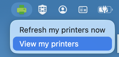 On a Mac, you should see a small printer icon in the top right corner of your screen. Click on this to view your available printers. If you do not see your printers listed, select Refresh my printers now from the same icon. If prompted, be sure to Sign in with Google using your @dcgschools.com account.