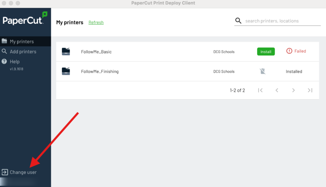If any of your computers say Failed, click on Change User to reauthenticate your PaperCut permissions with Google. This will force your available printers to reinstall with the correct user permissions.